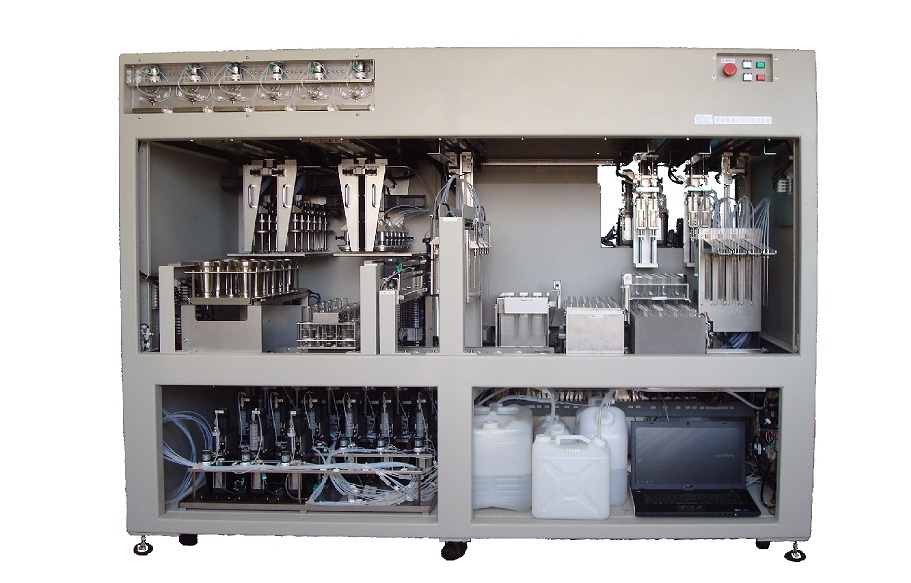 | 説明 | 概要 残留農薬を検出する為の前処理工程を自動で行う事を目的とした装置です。 粉砕した試料(検体)をカップに投入した後は ホモジナイズ・ろ過・定容・撹拌・分注・液々抽出・脱水濾過・濃縮・固相抽出・乾固までを行います。 最大12検体分をセットする事でそれぞれ12検体のLC/MS用とGC/MS用の試料が出来上がります。 ユーザー様のご希望する仕様にカスタマイズをする事が可能です。 |