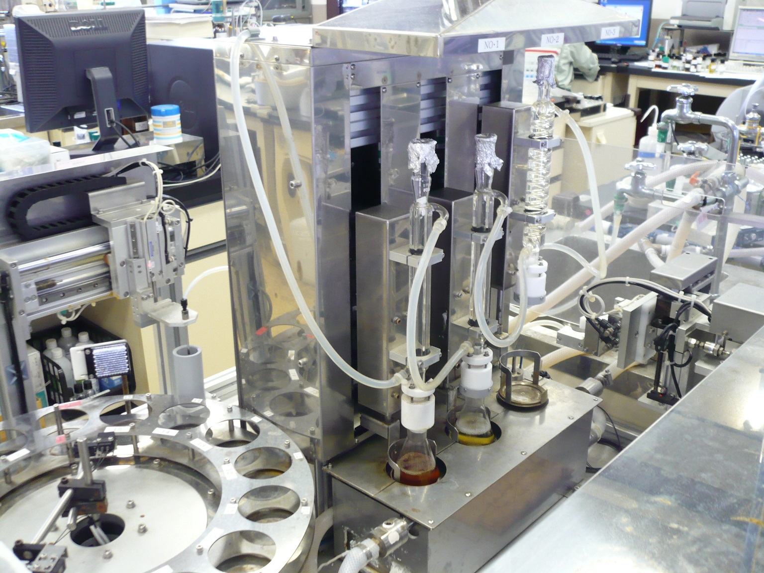 | 説明 | ビーカーに試料を計測しセットを行い自動運転を開始する事により、 それぞれ測定に従い溶液注入と温度管理、滴定法による水酸基価測定やケン化価測定を行います。 装置の動作管理およびデータの管理は、システム管理用データ処理装置(ノートPC)にて行います。 この装置以外にも、お客様の仕様にあわせてオーダーメイド致します。 |