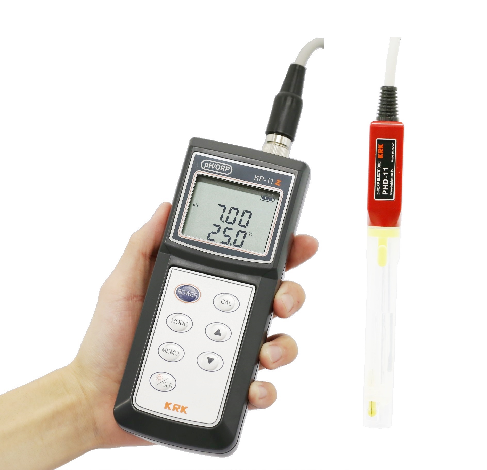| 説明 | 本pH/ORP計は,1本の電極でpH、ORPと水温の測定を行うことができます。校正は,ワンタッチで行うことができますので,取り扱いも簡単です。 また,各種自己診断機能やオートパワーオフ機能もあります。 本体:型式承認 第SS242号 電極:型式承認 第S251号 ・測定方式:pH ガラス電極法 水温 サーミスタ ・測定範囲:pH 0.00~14.00 ORP 0~±1999mV 水温 0.0~50.0℃ ・表 示:液晶デジタル表示 pH(or ORP)と水温を 同時表示 |