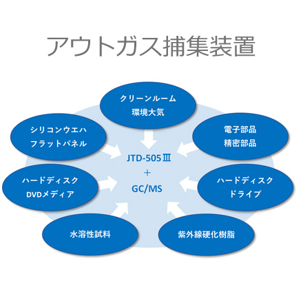 | 説明 | 業界最大容量の内径12mm(有効内容積10mL)試料管を採用した本機は、小物部品や各種材料をそのまま試料管にセット可能で、直接サンプルを加熱し発生する揮発性有機成分を加熱脱着-濃縮しGC/MSへ導入が可能です。 新製品のJTD-750では熱抽出時のガスを選択できるようになり、例えば空気雰囲気中での加熱により生じる成分の測定にお役立ていただけます。 オプションのアウトガス捕集装置を使うことで、常温や加熱下、UV照射下で大型部品などから生じる発生ガスを捕集・導入することができます。 【特長】 ■業界最大容量の試料管で、小物部品やペレット状の材料を直接試料管に入れて、揮発性成分分析が可能です。 ■キャリアガスと異なる雰囲気中での熱抽出が可能 ■試料管は、Tenaxなどの吸着剤を大量に詰められるためブレークスルーも低減できます。 【仕様】 ●試料検体数:15本 ●試料加熱温度:0~350℃ ●濃縮冷却温度:-150℃~室温 ●脱離加熱方式:高周波誘導加熱方式 ●コントローラ:タッチ式操作パネル ●動作プログラム:48検体設定可能 ●液体窒素デュワー瓶:50L付属 【用途】 室内空気汚染物質測定 作業環境揮発性物質測定 建材放散VOCガス測定 揮発性有機化合物分析 高分子材料からのの発生ガス、異臭分析 食品からの匂い・香料分析 電子部品や工業部品からのアウトガス分析 |