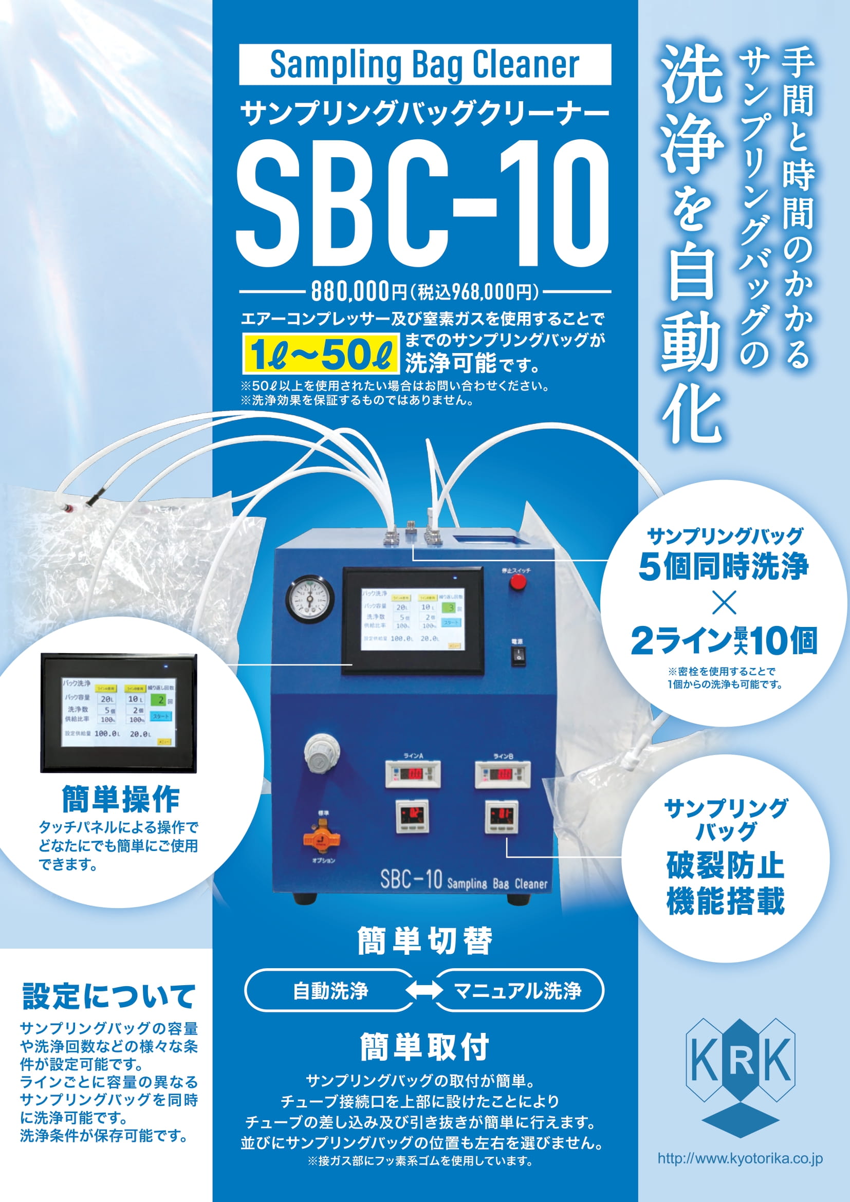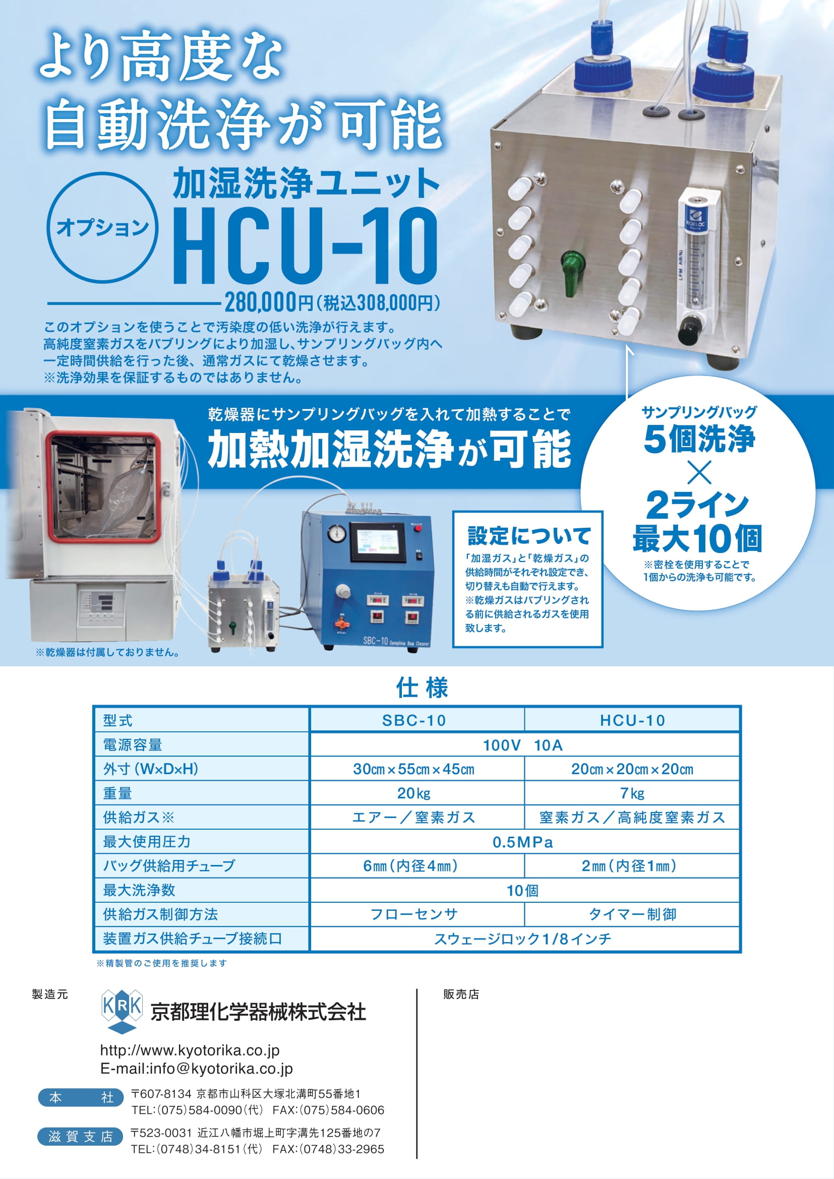 | 説明 | 手間と時間のかかるサンプリングバッグの洗浄を自動化! ・エアーコンプレッサーや窒素ガスを使用してサンプリングバッグの洗浄が可能です。 ・最大10個のサンプリングバッグの洗浄が同時に行えます。 ・タッチパネルによる簡単操作。 ・サンプリングバッグの破裂防止機能搭載。 ・オプションの加湿洗浄ユニット HCU-10を使用することで加湿ガスでサンプリングバッグの洗浄が行えます。 また、乾燥機にサンプリングバッグを入れて加熱することで加熱加湿洗浄が可能です。 |